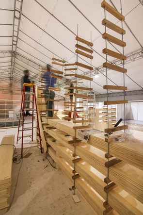 Tras el diseño arquitectónico del proyecto por parte de Al Borde, Nos encargamos del proyecto ejecutivo, desarrollo tecnológico y construcción de los apilamientos de Madera tomando en cuenta que la madera no podía ser alterada o dañada ya que funcionaría como materia prima para la construcción de dos prototipos post-terremoto.